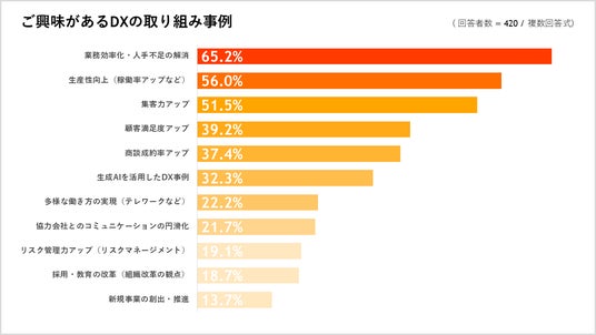 ◆ 興味があるDXの事例は「業務効率化・人手不足の解消」が最多で65.2%、次いで「生産性向上(稼働率アップなど)」が56.0%、「生成AIを活用したDX事例」が32.3%