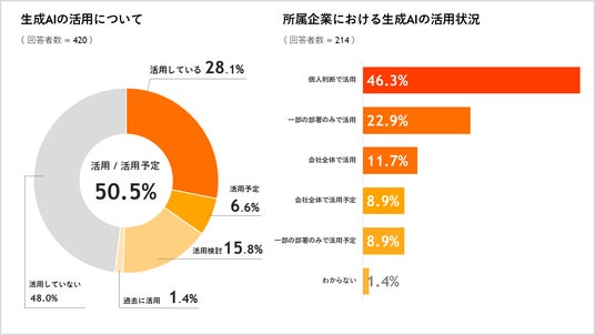 ・業務で生成AIを「活用している」のは28.1%、「活用を予定・検討している」は22.4%、利用者は「住宅・物件の紹介文などの作成」「広告クリエイティブの作成」「情報収集」などに活用