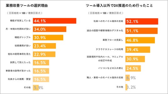 ・DXサービスなど、業務改善ツールの選択理由は「機能が充実している」が最多で44.1%、ツール導入以外でDX推進のために行ったことは「社員へのモバイル端末の支給」が最多で52.1%