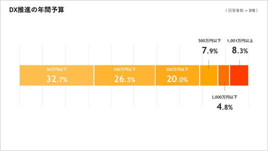 また、従業員数11-100名の企業では「100万円以下」が最多、従業員数101-500名以下の企業では「300万円以下」、従業員数501名以上の企業では「1,000万円以上」が最多となりました。DX年間予算は企業規模に比例し増大する傾向にあります。