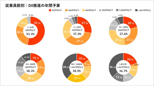 ・DX推進のための年間予算は従業員10名以下では「50万円以下」、11-50名以下では「100万円以下」、51-100名以下では「300万円以下」、101-500名以下では「300万円以下」、501名以上では「1,001万円以上」が最多