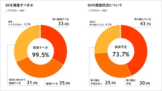 「DX推進についての意見をお教えください」という質問に対し、強く推進すべきだと思う・推進すべきだと思う・状況にあわせて推進すべきだと思う、をあわせると「推進すべき」という意見は99.5%に上りました。また、「貴社はDXに取り組まれていますか?」という質問に対し、73.7%が「実際に取り組んでいる・取り組む予定」と回答しました。