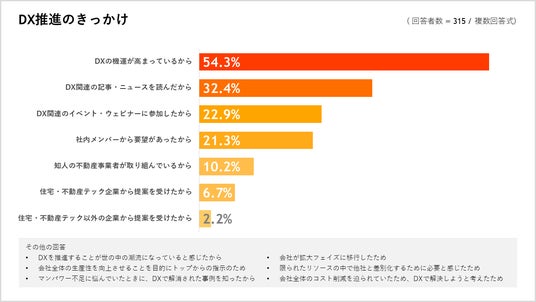 DXに取り組もうと思ったきっかけについて質問したところ、54.3%が「DXの機運が高まっているから」と回答しました。次いで「DX関連の記事・ニュースを読んだから」が32.4%、「DX関連のイベント・ウェビナーに参加したから」が22.9%でした。