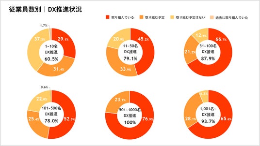 ◆ 従業員数別のDX推進状況は「501-1,000名」で100%、「1-10名未満」も60.5%に