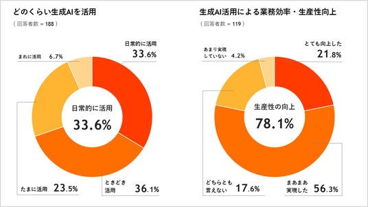 ・生成AIの活用頻度は「日常的に活用」が33.6%、生成AIの活用によって業務効率・生産性向上は「とても向上・まあまあ向上」が78.1%で多くの事業者が効果を実感