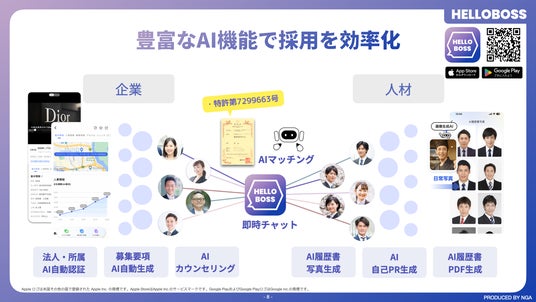 『HelloBoss』は従来の「仲介型」や「掲載型」と徹底的に差別化を図る、日本初の第3世代AI採用サービスです。NGA独自のAIによる企業と求職者のマッチング・チャット機能(特許第7299663号)を搭載し、国内最大級の550万社以上の企業データベースも無料公開しています。格安の料金体系とともに、採用と求職の効率化とコスト削減を実現し、社会全体での人材流動促進を目指しています。