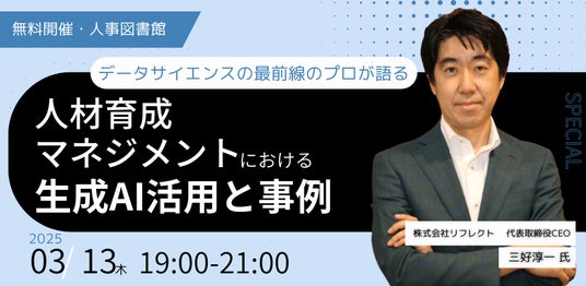 人事図書館を運営する株式会社Trustyyle(本社:東京都中央区・代表取締役:吉田 洋介)は、株式会社リフレクトの代表取締役CEO、三好淳一氏をお迎えし、2025年3月13日(木)に「人材育成・マネジメントにおける生成AI活用と事例」を開催。本イベントは『社内で人事業務を担っている方』のみのご参加となっていましたが、おかげさまで定員に達しましたので、申込受付を終了いたしました。