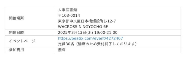 開催予定のイベント情報は人事図書館Peatixにてご確認いただけます。フォローいただくと新しいイベントが公開された際にメールで通知されます。ぜひフォローしてお待ちください。