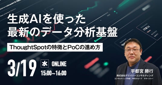 データリテラシーの向上を通じてデータドリブンカンパニーへの変革を支援する株式会社デリバリーコンサルティング(本社:東京都港区、取締役CEO:内藤 秀治郎)は、これまで多くの企業のデータ活用、データ基盤構築・整備を支援してきたナレッジをもとに、検索×AIを活用した次世代データ分析プラットフォーム「ThoughtSpot」の特徴とPoCの進め方について解説するWEBセミナーを開催いたします。