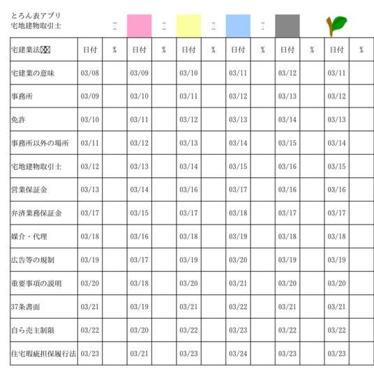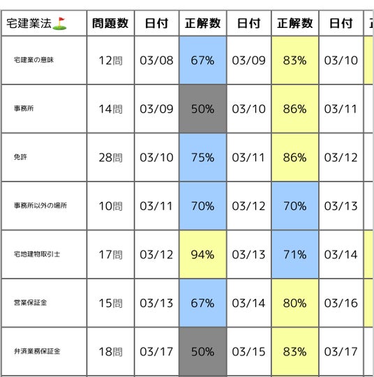 これにより、自分の弱点分析が色別判断でき、そこを重点的に補うことで効率的な復習が可能となり、見事に宅建試験に合格することができました。(独学初学)