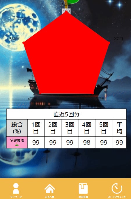 リンゴチャートでやる気UP🍎上の正解率直近5回分の1周分の正解率がレーダーチャートで見える化される。