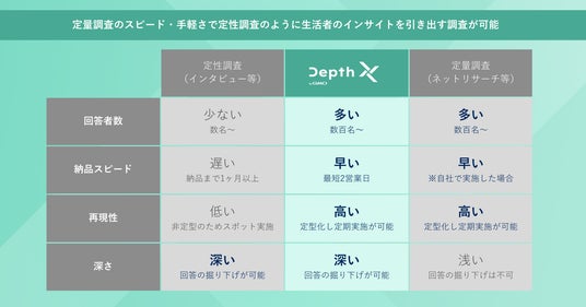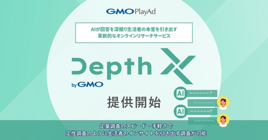 GMOインターネットグループにおいてCM動画に関するリサーチ事業を展開するGMOプレイアド株式会社(代表取締役社長:冨岡 信之 以下、GMOプレイアド)は、2025年3月10日(月)より、オンラインリサーチサービス「Depth X byGMO」の提供を正式に開始します。「Depth X byGMO」は生成AIを活用し、回答内容に応じた追加質問を自動生成することで、従来の大規模調査では難しかった「一人ひとりの回答を深掘りする調査」を実施可能にします。これにより、企業のマーケティングや商品企画の担当者は、より多くのリアルな生活者の声を短期間で収集し、新商品の開発や既存サービスの改善において、迅速かつ確実な意思決定を実現できます。