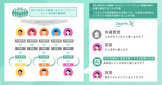 「Depth X byGMO」は、生成AIを活用した新しいオンラインリサーチサービスです。国内最大級の約3,400万人の調査対象者(パネルネットワーク)(※2)に対してアンケートを実施できるだけでなく、AIが回答者の回答を深掘りし、より具体的な生活者の本音やインサイトを引き出します。
