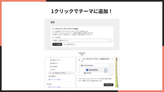Shopifyアプリである「シンプルカウントダウンタイマー|お手軽残り時間表示」を使うと、1 クリックでカウントダウンタイマーをテーマに追加可能です。