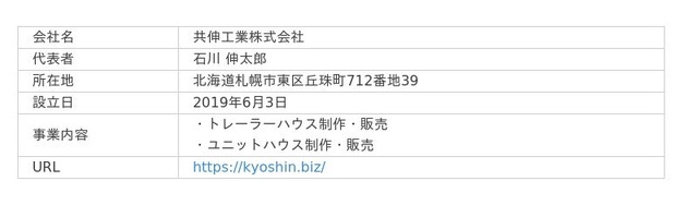 共伸工業株式会社共伸工業株式会社は、2019年に創業したトレーラーハウスとユニットハウスの制作・販売会社です。ほとんどの工程を自社で行っているため、低価格かつスピーディーな納品が可能です。また、法人や団体から個人まで幅広く対応しており、フルオーダーでの受注にも対応しております。