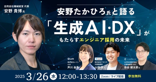 技術者・研究者に特化した採用・キャリア支援サービスを提供する株式会社アカリク(本社:東京都渋谷区、代表取締役:山田 諒)は、AIエンジニアであり「デジタル民主主義2030」プロジェクトを主導する安野 貴博氏をはじめ、株式会社レイン代表の芦川 由香氏、LAPRAS株式会社代表の染谷 健太郎氏、株式会社アカリク代表の山田 諒が一堂に会し、最新のトレンドや実践的な戦略について議論するウェビナーを開催いたします。
