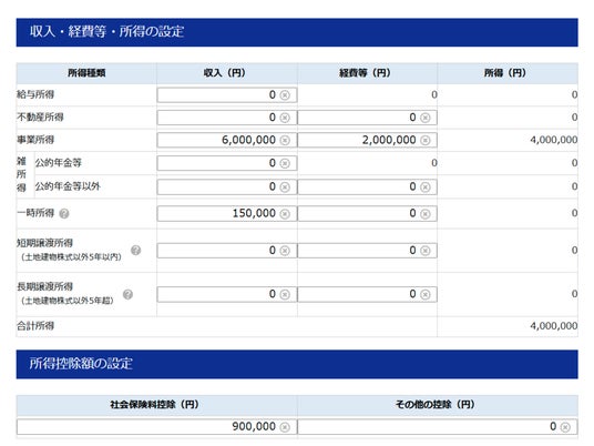 続いて、収入や経費の情報と所得控除の金額を入力ください。