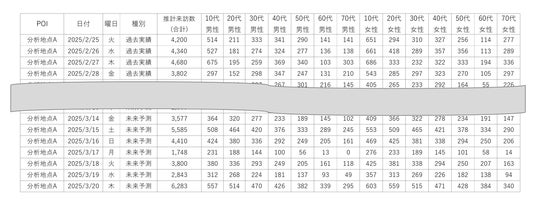 (注1)本モデルはAIにより統計・推計処理された各POIの過去の来訪数や来訪周期性などのデータを学習して算出するため、対象POIには十分な過去データの蓄積が必要です。また、周期性がないイベントの予測や、来訪数が極端に少ないPOIの予測については、精度が低下する可能性があります。