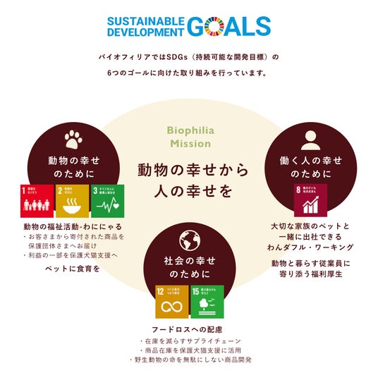 日本では動物の殺処分などによって多くの尊い命が失われています。どの命も脅かされることなく生きる喜びを感じて欲しい、という想いで当社は、SDGsの「leave no one behind(誰ひとり取り残さない)」という原則のもと、「動物も、誰ひとり取り残さない」を目標に掲げ、お客さまとともに「わににゃるプロジェクト」としてSDGsや動物福祉活動に取り組んでいます。