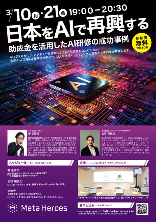 株式会社Meta Heroes(本社:大阪府大阪市、代表取締役:松石和俊、以下「当社」)が運営するDX教育施設「Hero Egg」にて、2025年3月10日(月)、SNS総フォロワー数33万人超税理士の笹圭吾(ささ けいご)氏をゲストに迎え、「助成金を活用したAI研修の成功事例」をテーマにした特別セミナーを開催いたしました。