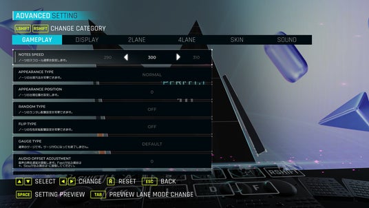 ゲームオプション:ハイスピード調整、判定タイミング調整など、リズムゲームには欠かせない細かな設定が可能 です。