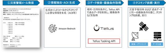 なお本実証実験のシステムには、経済産業省の「多種衛星のオンデマンドタスキング及びデータ生産・配信技術の研究開発」の一環としてTellusが開発を行っているオンデマンドタスキングシステム、およびAmazon Web Services(AWS)が提供する生成AIサービス「Amazon Bedrock」を使用しました。