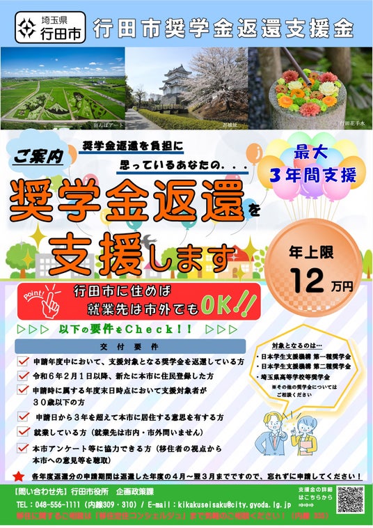 支援金額は、申請年度において返還した奨学金の額の1/2、年上限12万円で、最大3年間が対象になります。