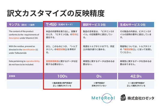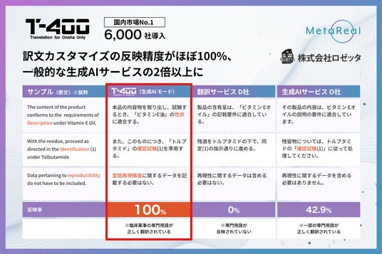 その結果、ロゼッタの「T-4OO」では、指定した参考文献からの専門用語の反映率がほぼ100%となり、一般的な生成AIサービスを用いた場合との比較で2倍を超える精度を確認いたしました。