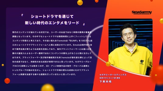 現代のコンテンツが溢れている状況では、ユーザーのお金ではなく時間の獲得が最重要課題となっています。その中でもショートドラマは隙間時間に上手くフィットしているコンテンツ形態だと考えており、その追い風もありemoleは「BUMP」を180万DL超えのショートドラマプラットフォームへと既に成長させています。emoleは制作者も含めて業界全員が潤うような成長を目指しており、海外プラットフォーマーとは違い広告費の大量投入によるユーザー獲得ではなくコンテンツの質を上げることに既に注力しております。プラットフォーマー及び制作機能両方を持つemoleが旗を振る事によって目先の成長ではなく、持続性のある成長が実現できると思っています。セガサミーグループのCVC部隊としては数多くのIP、3D・アニメ映像作品の制作・グローバル展開といったグループの強みを生かし、ショートドラマ市場の更なる成長にむけてプラットフォーム発展を加速する様々な提携を行っていきたいと思っています。