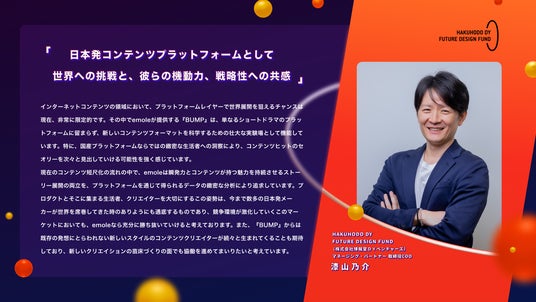 スマートフォンでの視聴に特化した話課金型のショートドラマは、世界的に注目される新しいコンテンツフォーマットであり、大きな可能性を秘めた市場です。emoleは日本においてこの市場を開拓し、創成期から制作と配信を手掛けてきた確かな実績があり、それがショートドラマアプリ「BUMP」における配信作品の質の高さに表れていると思います。また、澤村さんや水谷さんをはじめとするメンバーの “感性と科学のバランス”を大きな魅力として感じています。