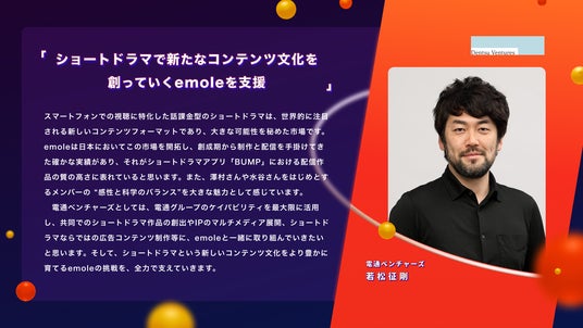 電通ベンチャーズとしては、電通グループのケイパビリティを最大限に活用し、共同でのショートドラマ作品の創出やIPのマルチメディア展開、ショートドラマならではの広告コンテンツ制作等に、emoleと一緒に取り組んでいきたいと思います。そして、ショートドラマという新しいコンテンツ文化をより豊かに育てるemoleの挑戦を、全力で支えていきます。