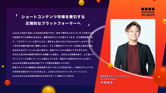 初回ラウンドから継続的に追加投資できていることを光栄に思い、今回のラウンドでも引き続き支援させていただきました。これからもサムライインキュベートとして、emoleがさらなる成長を遂げるためのサポートを続けていきます。