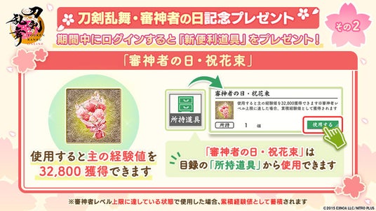 期間中、ゲームにログインした全ユーザーを対象に、新便利道具「審神者の日・祝花束」「気力+30バー」や、「御伴撮影」機能で使用できる「フレーム」「写真スタンプ」が贈られる「刀剣乱舞・審神者の日記念ログインプレゼント」を実施いたします。