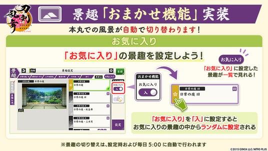 新たに実装した景趣「おまかせ機能」は、所持している景趣の中からお気に入りの景趣をあらかじめ設定すると、本丸の景趣がお気に入りの景趣からランダムに設定されて自動で切り替わります。