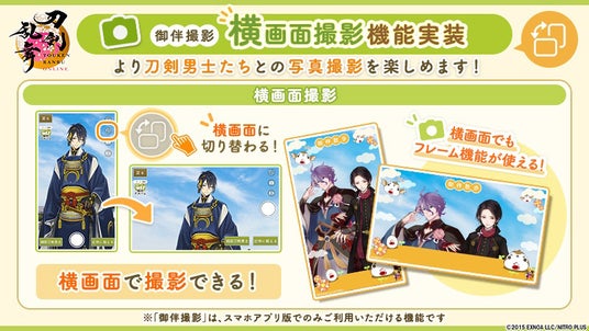 スマホアプリ版のみで使用できる「御伴撮影」に、スマートフォン端末を横画面にして写真撮影ができる機能を追加実装いたしました。