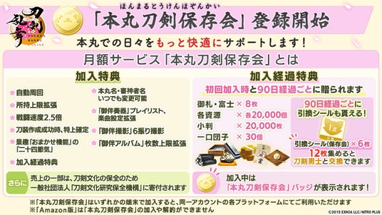 さらに、『刀剣乱舞ONLINE』をより便利に楽しんでいただく機能が詰まった月額サービス「本丸刀剣保存会」を新たに開始いたしました。