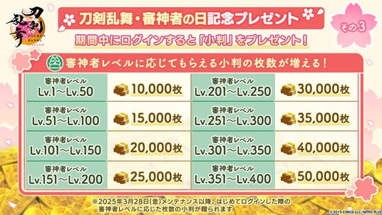 本ログインプレゼントでは、審神者レベルに応じた小判も入手できます。