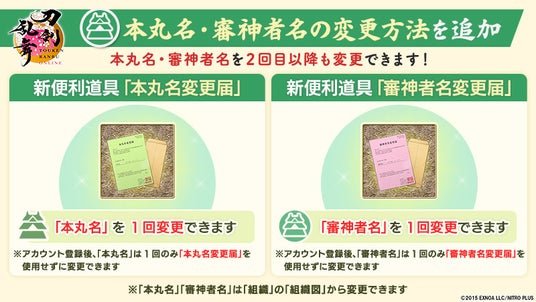「本丸名変更届」を使用すると「本丸名」を変更でき、「審神者名変更届」を使用すると「審神者名」を変更できます。
