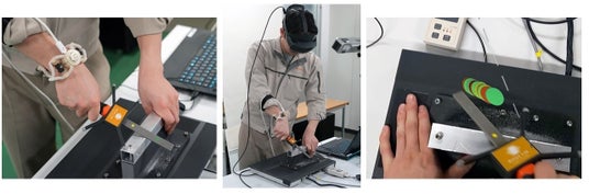 また、記録した触覚は、腕輪型デバイスに内蔵されたバイブレーターを用いて、振動体感を忠実にバイブレーターで再生することが可能です。このように手首位置で振動体感を記録し、忠実に再生するには、記録する作業者と体験者間における手指からの振動の伝わりやすさの個人差を補正したり、小型のバイブレーターでも再生できる信号に変換する必要があります。開発した触覚知覚量に基づく触覚信号の強調技術を用いて、個人差を補正し、バイブレーターが提示する体感量を忠実に制御することが可能になりました。これにより、世界で初めて、個人の触覚の伝わりやすさの違いを補正しながら、振動体感を共有可能なAR技能教育システム※8を実現しました。
