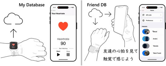 筑波大学は、これまでに開発した疑似心拍振動※11により、従来の覚醒の度合いを示す感情の表現に加え、「快―不快」の感情の表現が可能であることを実験により確認しました。また、この疑似心拍振動を介してカメラやウェアラブルデバイスから計測した表情や心拍数などの生体信号を伝達することにより、相手の存在感が強まることを実験により確認しました。これらの実験の成果を基に、手軽に二者間で振動を介して心拍数を共有可能なiPhoneおよびApple Watchユーザー向けの心拍数共有アプリ※12を一般公開しました。ビデオゲームで対戦している際の二者間や、競技中のアスリートからコーチまたは視聴者など、さまざまな場面で相手の心拍数の変化に触れる体験を提供します。