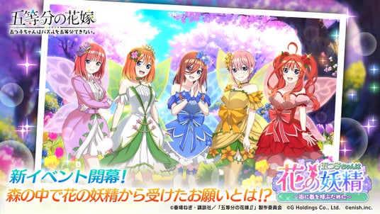 株式会社enish(本社:東京都港区、代表取締役社長:安徳 孝平、以下enish)は、2025年4月4日(金)より、アニメ「五等分の花嫁」初となるゲームアプリ『五等分の花嫁 五つ子ちゃんはパズルを五等分できない。』にて、週刊少年マガジン編集部完全監修のゲームオリジナルストーリーをお楽しみいただける新イベント「五つ子ちゃんは花の妖精!?~街に春を呼ぶために~」を開催いたします。