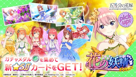 また、イベントに先駆け3月31日(月)より、五つ子の花の妖精衣装を描き下ろしたイラストのカードが手に入るガチャを開催中です。