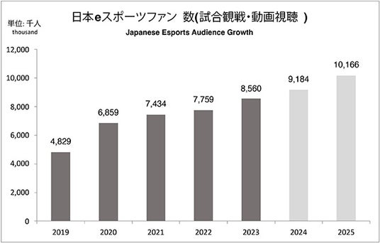 2023年の日本eスポーツファン数(試合観戦、動画視聴経験者、地上波番組等の関連放送視聴経験者)は、前年比110.3%の856万人と推定。2025年には1,000万人を超えると予測します。