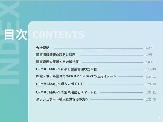 株式会社ベクトル(本社:東京都港区、代表取締役会長兼社長:西江 肇司、東証プライム:6058)の子会社であるOwned株式会社(東京都品川区、代表取締役社長、石井翔、以下「当社」)は、旅館・ホテル業界向けに「CRM×ChatGPTで営業管理をする方法をまとめたレポート」2025年3月版(全40ページ)を無料公開いたしました。