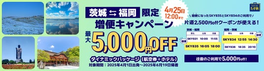 スカイパックツアーズ株式会社(本社:東京都中央区、社長:横山正巳)は、スカイマーク公式サイト内で増便になった茨城⇔福岡線を利用するとダイナミックパッケージ『たす旅』がお得にお申し込みいただけるキャンペーンを実施します。