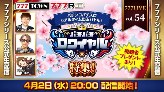 ライターの「射駒タケシ」さんをゲストに迎え、今回は777Realにてリアルタイムで出玉バトルが行える機能「パチパチロワイヤル」を大特集!出演者同士での対決企画、さらに配信中に出演者とマッチングされた方には777Realのゲームアイテムをプレゼント!