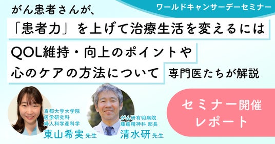 本セミナーでは、「がん治療中のQOLを高める鍵」をテーマに京都大学大学院医学研究科の東山希実先生が、また「がんと向き合う上で知っておきたい心のケア」についてがん研有明病院 腫瘍精神科の清水研先生が、それぞれの専門的視点から、実践的なアドバイスを提供しました。本レポートでは、当日の先生方の講演の一部をご紹介します。