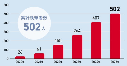 社内エンジニアの協力のもと、記事のPV数やスキ数、反響等の成果を自動的に可視化するデータ基盤を構築し、執筆者へのフィードバックや運営改善に活用しています。また、各記事の成果だけでなく、執筆に関するナレッジシェアや新規執筆者の紹介などを定期的に行うことで、執筆者を中心とした社内コミュニティを形成し、職種や所属部署を超えた執筆者同士の横のつながりを生んでいます。これらの取り組みにより、累計執筆者数は500人を超えるなど、執筆者コミュニティは拡大を続けています。