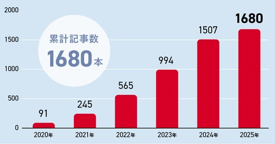 SHIFT Group 技術ブログでは、記事入稿から公開までの業務を分解・分析し、分業体制を取ることで運営・発信の効率化を図るとともに、各事業部門内でのレビューと広報によるレビューという二重のレビュー体制を敷くことで、高品質なコンテンツ発信を実現しています。開設時点では19本だった記事数は、2025年3月末時点で約1,700本と約90倍に増加しました。