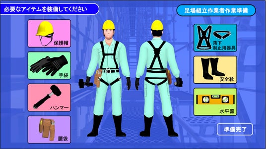 足場組立作業ゲーム:保護具等装備確認画面